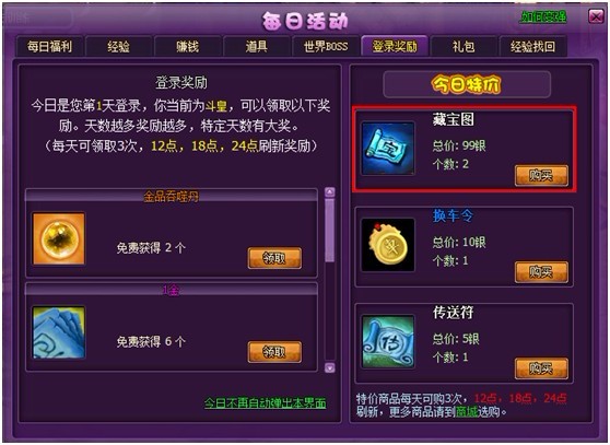 1.       登录奖励中的每日特价增加藏宝图售卖,99银2张