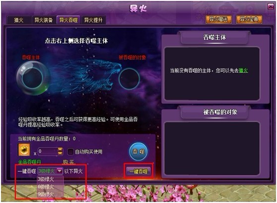4.       优化了异火一键吞噬的功能,增加了一键吞噬绿火的等级的下拉选项