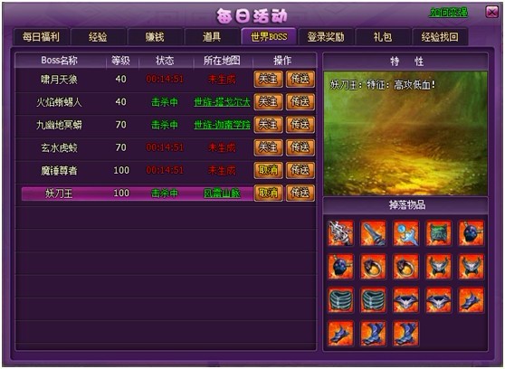 5.新增中立区世界boss——魔锤尊者,妖刀王,等级100,几率掉落橙色斗宗套装部件