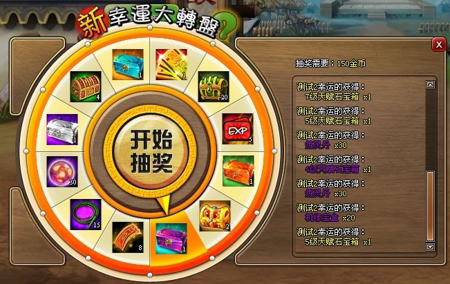 【活动介绍】:活动当天玩家可点击游戏中的“新幸运转盘”活动按钮,在打开的活动界面中参与活动,70级以下玩家每次可花费90金币转动转盘,赢取相应的奖励;70级以上玩家每次可花费150金币转动转盘,赢取更高价值的奖励。