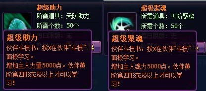 3、 新增伙伴通用技能—超级助力(增加主人力量5000点)、超级聚魂(增加主人魂力5000点)。玩家可以在兑换商城中使用50本相对应的天阶技能书可以兑换这两种超级技能,并且黄阶伙伴第四形态方可学习。