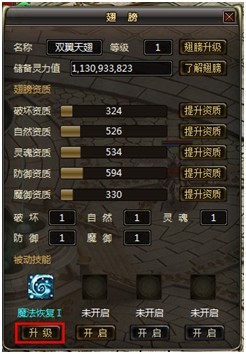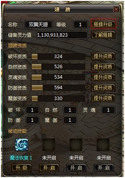 点击翅膀升级按钮即可完成翅膀升级操作,翅膀每次升级将恒定消耗800万灵力值。