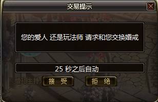 男方发起结婚后女方的界面中弹出一个询问是否同意的提示框。如果女方同意则结婚成功,若女方拒绝,则结婚失败,失败不退还男方的10万金币。