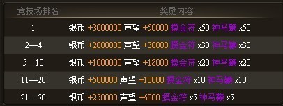 5. 活动描述:擂台争霸,一决雌雄。合服后开启竞技排行争夺活动,在活动结算日时,达到相应的竞技场排名的玩家将能获得排位奖励。